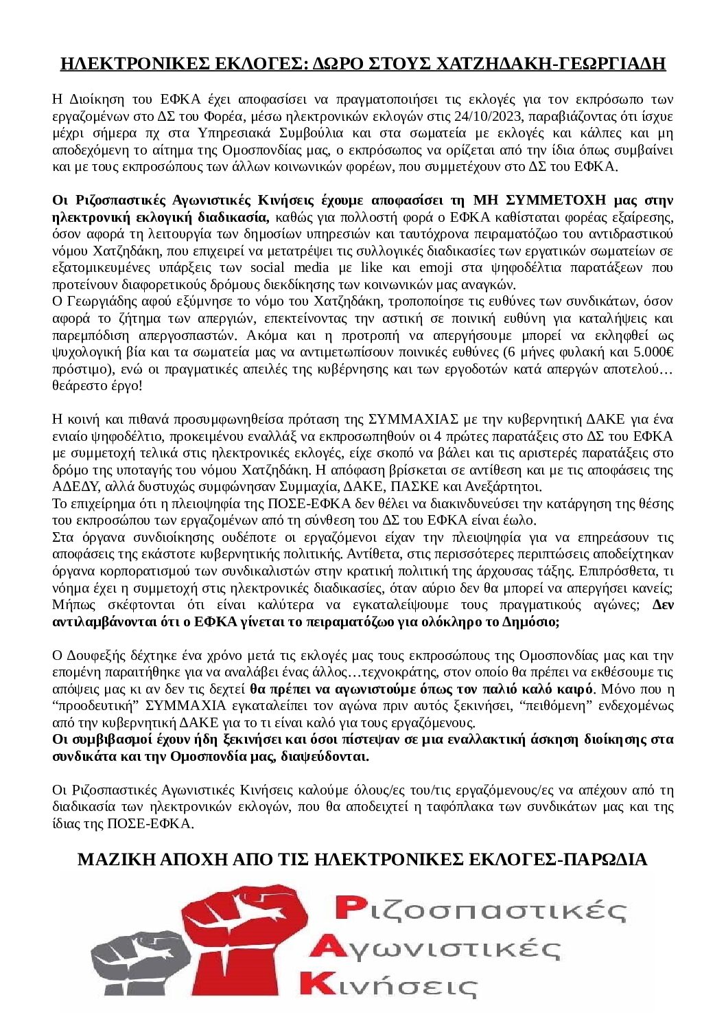 ΡΙΖΟΣΠΑΣΤΙΚΕΣ ΑΓΩΝΙΣΤΙΚΕΣ ΚΙΝΗΣΕΙΣ (ΡΑΚ) ΑΠΟΧΗ ΑΠΟ ΤΙΣ ΗΛΕΚΤΡΟΝΙΚΕΣ ΕΚΛΟΓΕΣ Από Γραμματεία ΣΕ-ΕΦΚΑ - 23 Οκτωβρίου, 2023 0 63 FacebookTwitterPinterestWhatsApp