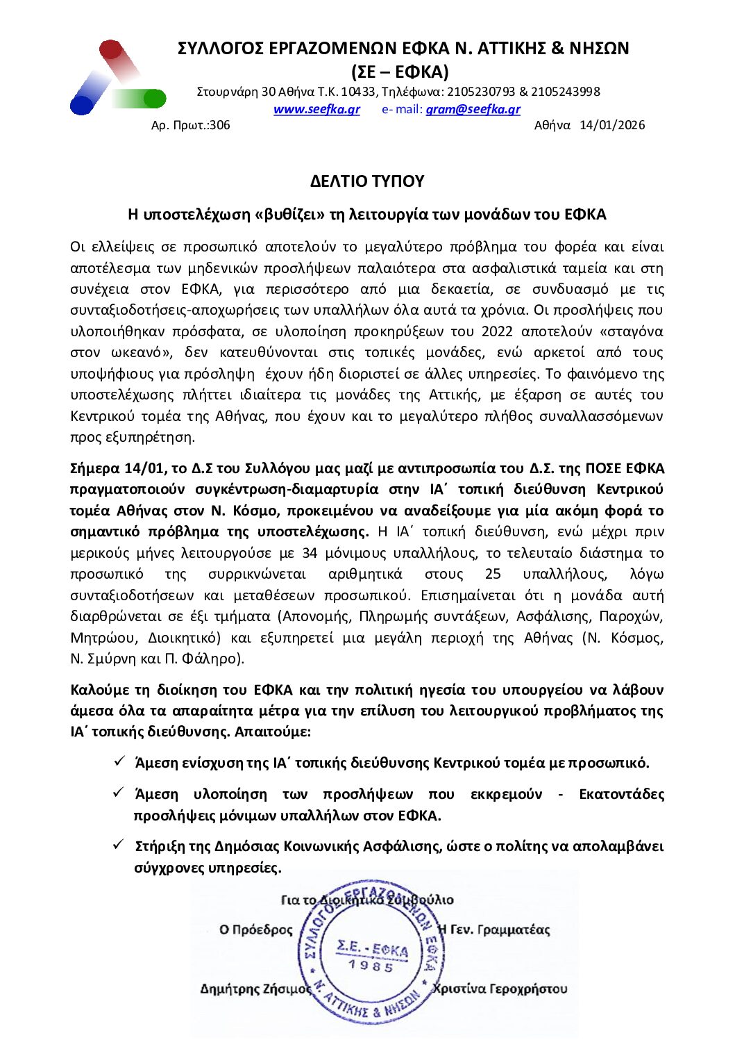 ΑνακοινώσειςΔραστηριότητεςΣημαντικά ΔΕΛΤΙΟ ΤΥΠΟΥ Η υποστελέχωση βυθίζει τη λειτουργία των μονάδων του ΕΦΚΑ Από Γραμματεία ΣΕ-ΕΦΚΑ - 14 Ιανουαρίου, 2026 0 48 FacebookTwitterPinterestWhatsApp ΔΕΛΤΙΟ ΤΥΠΟΥ
