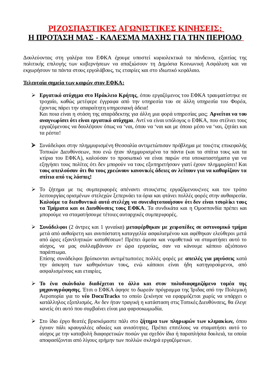 ΡΙΖΟΣΠΑΣΤΙΚΕΣ ΑΓΩΝΙΣΤΙΚΕΣ ΚΙΝΗΣΕΙΣ (ΡΑΚ) Η ΠΡΟΤΑΣΗ ΜΑΣ – ΚΑΛΕΣΜΑ ΜΑΧΗΣ ΓΙΑ ΤΗΝ ΠΕΡΙΟΔΟ Από Γραμματεία ΣΕ-ΕΦΚΑ - 9 Νοεμβρίου, 2023 0 53 FacebookTwitterPinterestWhatsApp ΡΑΚ – Η πρόταση μας