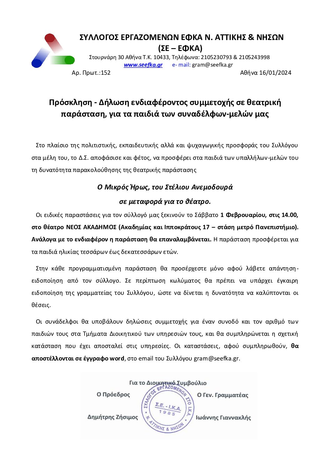 ΔραστηριότητεςΕκδηλώσεις ΠΡΟΣΦΟΡΑ ΘΕΑΤΡΙΚΗΣ ΠΑΡΑΣΤΑΣΗΣ ΓΙΑ ΤΑ ΠΑΙΔΙΑ ΤΩΝ ΣΥΝΑΔΕΛΦΩΝ – ΜΕΛΩΝ ΜΑΣ Από Γραμματεία ΣΕ-ΕΦΚΑ - 19 Φεβρουαρίου, 2025 0 97 FacebookTwitterPinterestWhatsApp ΔΙΑΒΑΣΤΕ ΠΕΡΙΣΣΟΤΕΡΑ