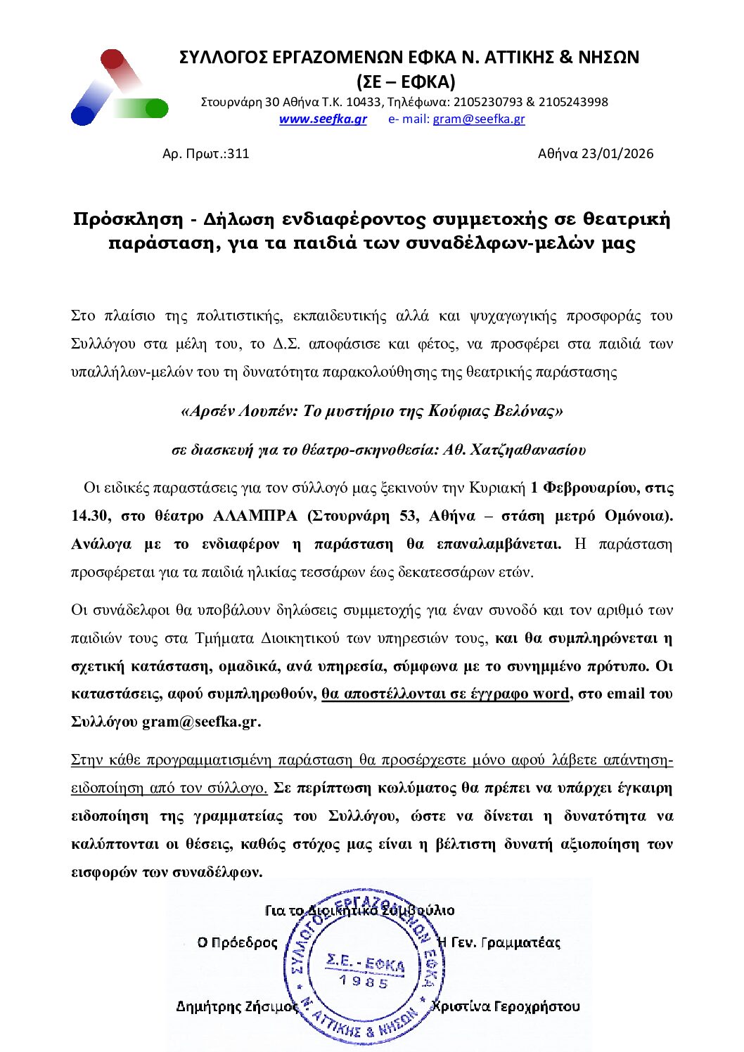 ΑνακοινώσειςΔραστηριότητεςΣημαντικά Πρόσκληση – Δήλωση ενδιαφέροντος συμμετοχής σε θεατρική παράσταση, για τα παιδιά των συναδέλφων-μελών μας Από Γραμματεία ΣΕ-ΕΦΚΑ - 23 Ιανουαρίου, 2026 0 59 FacebookTwitterPinterestWhatsApp ΕΚΔΗΛΩΣΗ ΕΝΔΙΑΦΕΡΟΝΤΟΣ.pdf
