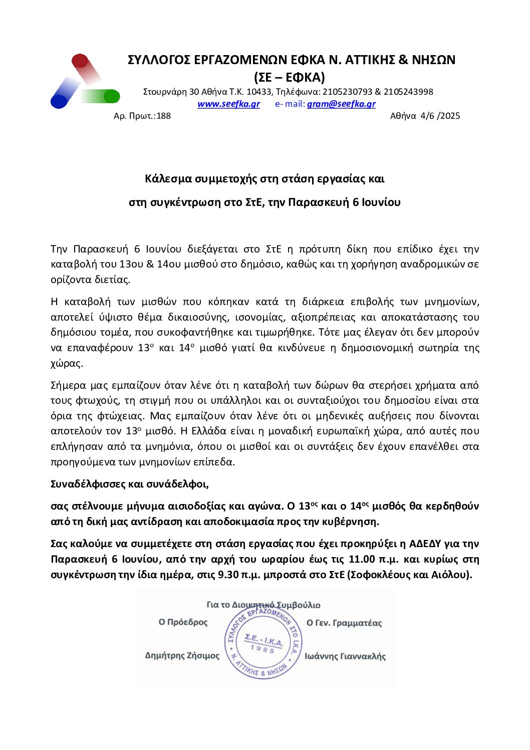 UncategorizedΑνακοινώσειςΔραστηριότητεςΑπεργίεςΣημαντικά ΣΤΑΣΗ ΕΡΓΑΣΙΑΣ 6-6-25 Από Γραμματεία ΣΕ-ΕΦΚΑ - 4 Ιουνίου, 2025 0 37 FacebookTwitterPinterestWhatsApp ΣΤΑΣΗ ΕΡΓΑΣΙΑΣ 6-6-25