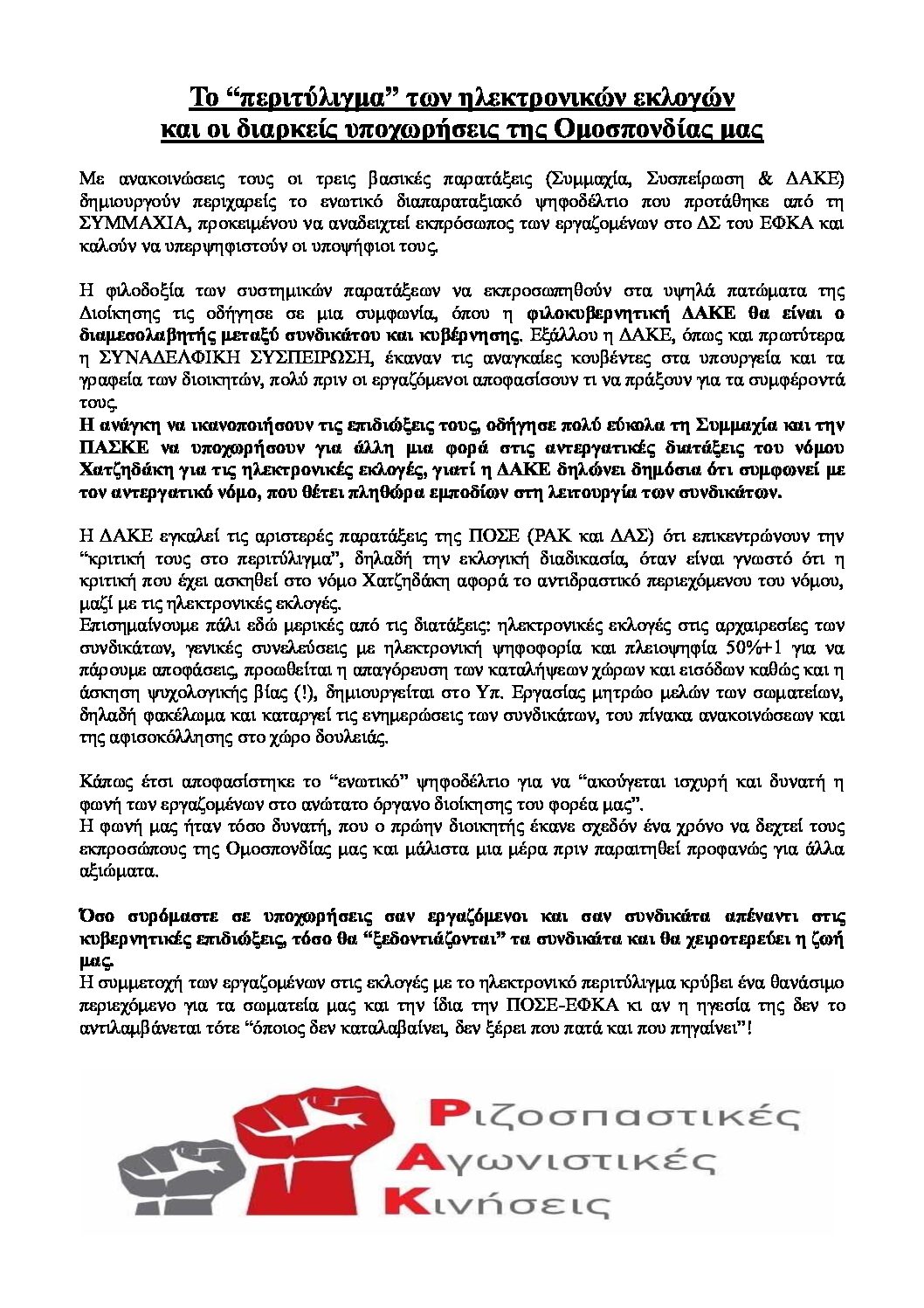 ΡΙΖΟΣΠΑΣΤΙΚΕΣ ΑΓΩΝΙΣΤΙΚΕΣ ΚΙΝΗΣΕΙΣ (ΡΑΚ) Το “περιτύλιγμα” των ηλεκτρονικών εκλογών και οι διαρκείς υποχωρήσεις της Ομοσπονδίας μας Από Γραμματεία ΣΕ-ΕΦΚΑ - 24 Οκτωβρίου, 2023 0 53 FacebookTwitterPinterestWhatsApp
