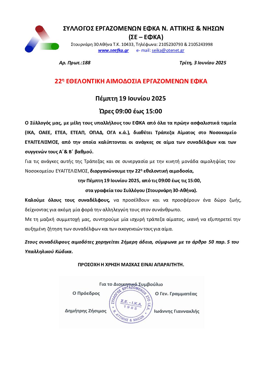 UncategorizedΑνακοινώσειςΣημαντικά 22η ΕΘΕΛΟΝΤΙΚΗ ΑΙΜΟΔΟΣΙΑ Από Γραμματεία ΣΕ-ΕΦΚΑ - 5 Ιουνίου, 2025 0 38 FacebookTwitterPinterestWhatsApp 22η ΕΘΕΛΟΝΤΙΚΗ ΑΙΜΟΔΟΣΙΑ22η ΕΘΕΛΟΝΤΙΚΗ ΑΙΜΟΔΟΣΙΑ